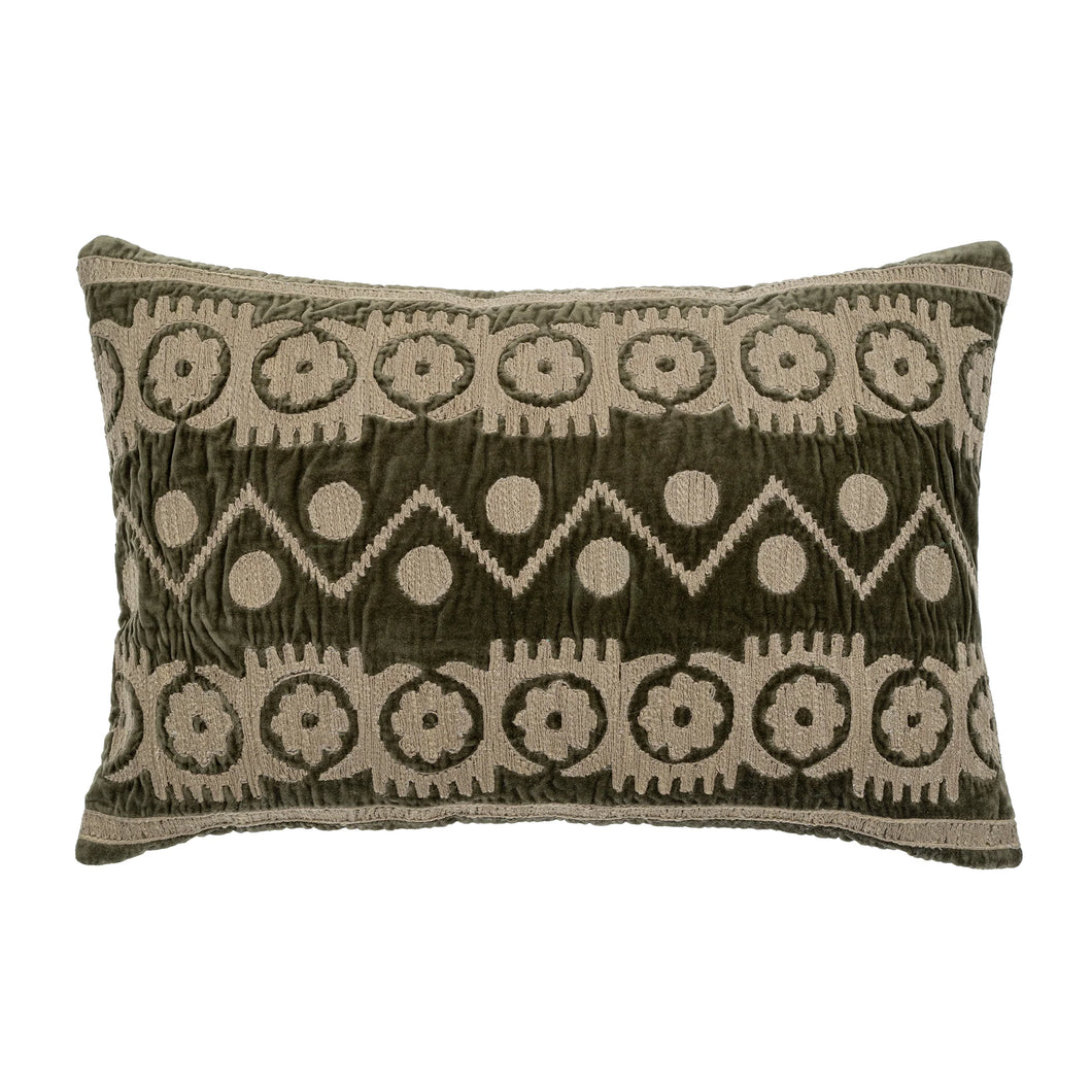 Add warmth and texture to your space with the Velvet Embroidered Pillow. Featuring a rich moss green velvet base, this lumbar pillow is adorned with warm beige cotton embroidery in an Aztec-inspired pattern, creating a striking contrast of softness and detail. Designed to bring a cozy and inviting feel, it serves as both a decorative and statement piece, perfect for layering on sofas, beds, or accent chairs.